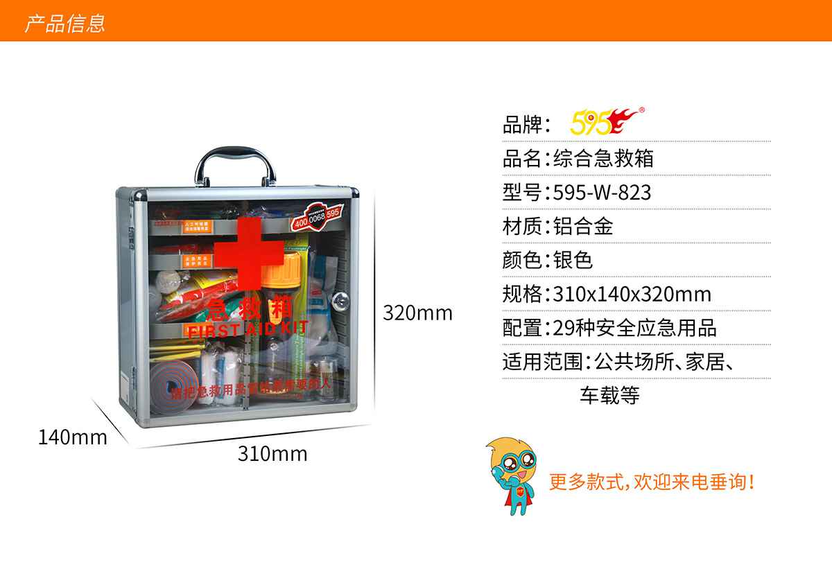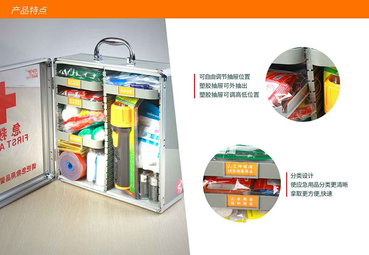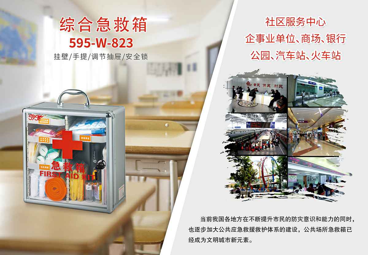 石家庄佑平家庭视频监控有限公司综合急救箱,独特的箱体设计,适用于劳保、厂矿、公共场所、办公室、车间、学校、社区、健身房、实验室、建筑工地等人员密集的场所及防灾减灾等领域。